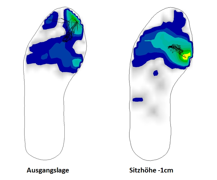 Wie im Druckbild links erkennbar, werden hauptsächlich die Zehen und der vordere Teil des Ballens belastet. Es liegt also eine Spitzfußstellung des Fußes vor, mit der die Druckphase des Tretzyklus‘ ausgeübt wird. Da die Zehen nicht der stärkste Teil des Fußes sind , bleibt die kräftigere Struktur des Ballens (vor allem das Großzehengrundgelenk) weitestgehend ungenutzt. Nach Reduzierung der Sitzhöhe (Druckbild rechts) verlagert sich der Hauptdruck auf den Ballen, vor allem auf den inneren Teil zum Großzehengrundgelenk. Das Muster des Kraftangriffspunkts (schwarze Linie) spricht für eine bessere Stabilität im rechten Bild. Die zu große Sitzhöhe schränkt die Bewegungsfreiheit der Ferse (aufwärts – abwärts) deutlich ein, so dass die Ferse nicht aktiv zur Unterstützung des Vorfußes genutzt werden kann. Außerdem führt die Tretbewegung mit spitzem Fuß dazu, dass nur ein kleiner Teil der aufgewendeten Kraft während der Druckphase wirklich in die ideale Tretrichtung ausgeübt wird. Dies wird in der Analyse der Kraftkurven deutlich: