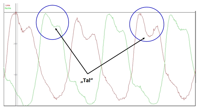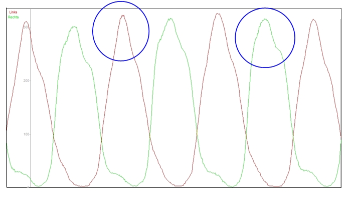 Die Spitzen der Kraftkurven repräsentieren jeweils die Druckphasen (linkes und rechtes Bein). Es wird deutlich, dass die Spitze nicht durchgängig auf einer Höhe bleibt, sondern durch ein Tal ( siehe Markierungen) in zwei Teile geteilt wird. Dieses Tal stellt einen Kraftverlust mitten in der Druckphase dar, der mit der nicht passenden Sitzhöhe begründet werden kann: Durch die muskuläre Limitierung des hinteren Oberschenkels verliert der Athlet Kontakt zum Pedal, um den Oberschenkel zu entlasten. Dies verhindert in jedem durchgeführten Tretzyklus eine optimale Kraftentfaltung! Was bei einer Kurbelumdrehung noch keine Rolle spielt, wird während einer Trainingseinheit schnell 15.000 Mal (3 Stunden Training mit Trittfrequenz 80 / Minute) wiederholt! Im Vergleich dazu, schauen wir uns das Ergebnis nach der Reduzierung der Sitzhöhe an: