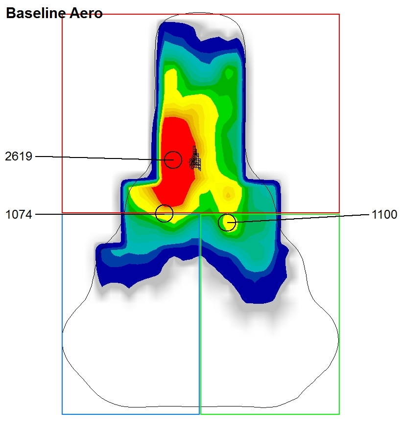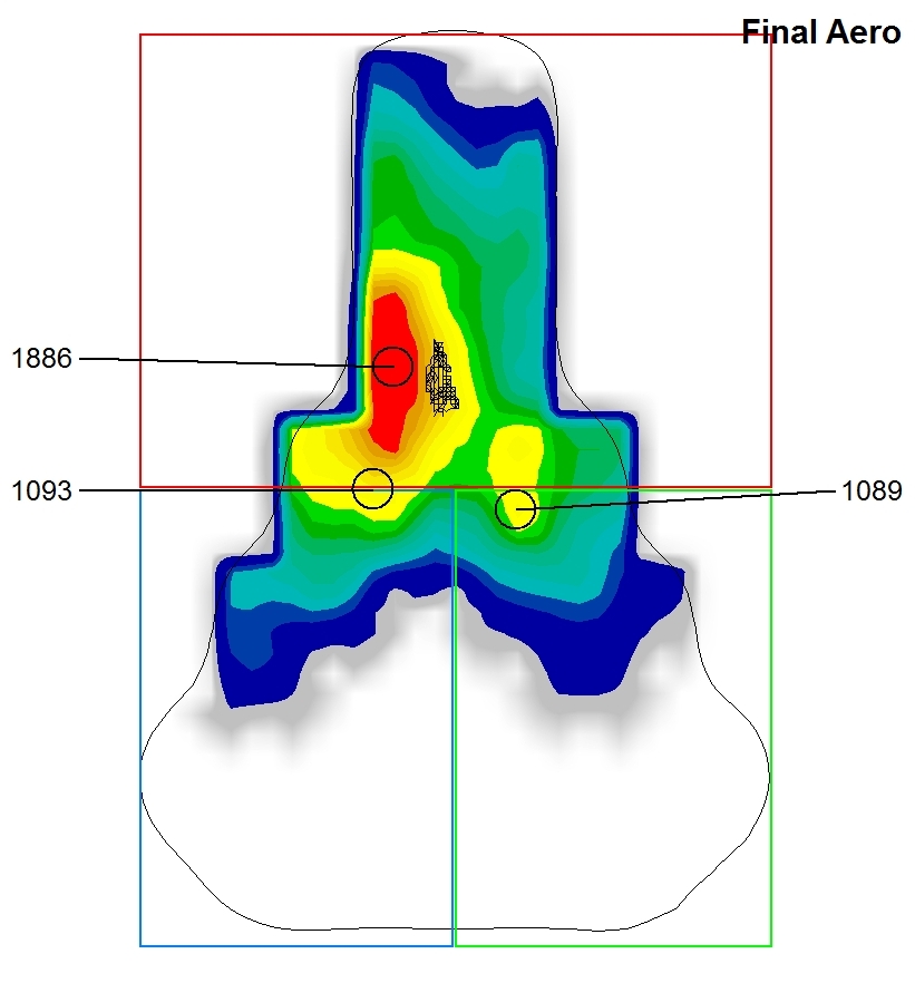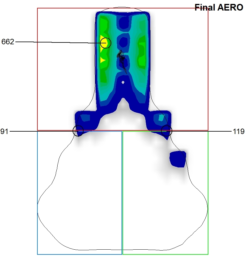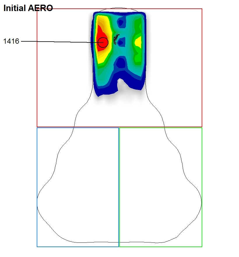 Wenn eine gute Beckenstabilität erstmal erreicht ist, kann die Suche nach Optimierungspotential am Cockpit weitergeführt werden. Et voila: Durch ein Anwinkeln der Extensions lagen nicht nur die Unterarme stabiler auf den Armpads, sondern der CdA-Wert nahm auch noch etwas ab (0,211). Den Effekt der erhöhten Stabilität im Cockpit kann man anhand des Kraftangriffspunktes auf den Armpads messen. Dieser „Druckschwerpunkt“ war in der Baseline in „größerer Bewegung“ (siehe Abb. 5), was auf eine verstärkte Aktivität der Oberarm/Schultermuskulatur schließen lässt. In der finalen Position befindet sich der Schwerpunkt (KAP) mittig auf einer sehr kleinen Fläche, was die verbesserte Stabilität nachweist (Abb. 6).